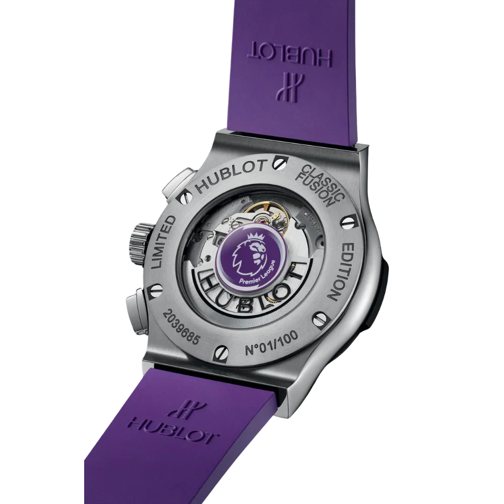 The H Classic Fusion Chronograph Premier League 42mm Ref. 541.NX.8970.RX.PLW23 is a special limited edition timepiece designed in partnership with the Premier League, celebrating the passion, energy, and global influence of the world’s most-watched football league. With a satin-finished titanium case, a bold Premier League purple sunray dial, and a worldwide release limited to just 100 pieces, this chronograph represents exclusivity, sport-inspired elegance, and Swiss craftsmanship.