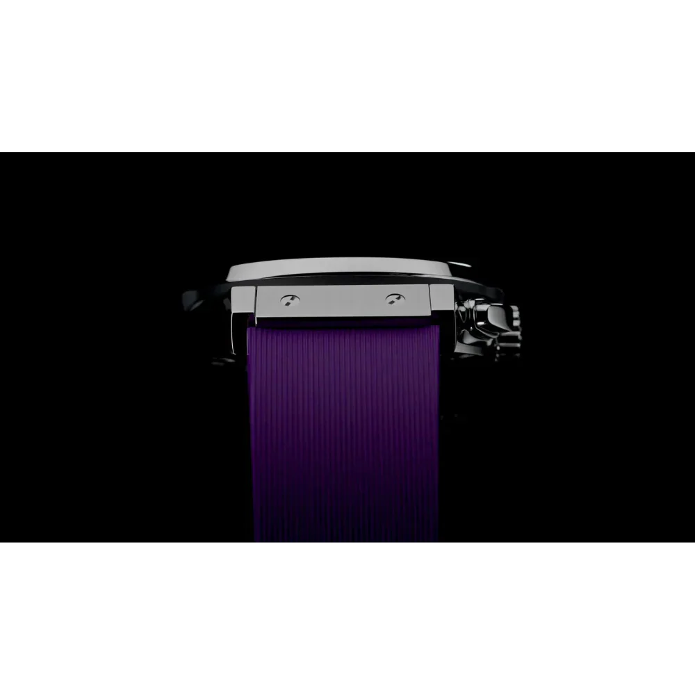 Strap: Black rubber with purple lining, titanium deployant clasp