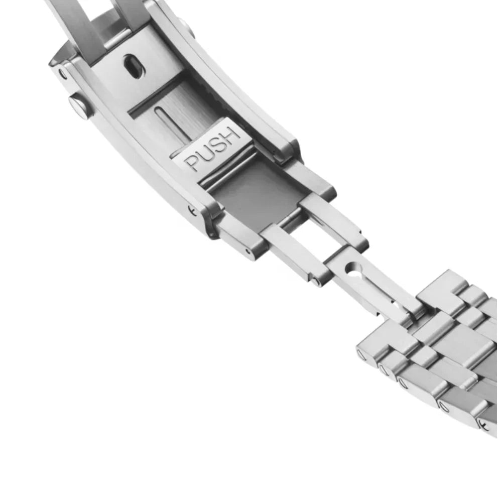 Bracelet & Clasp: Stainless steel bracelet with foldover diver’s extension and micro-adjustment