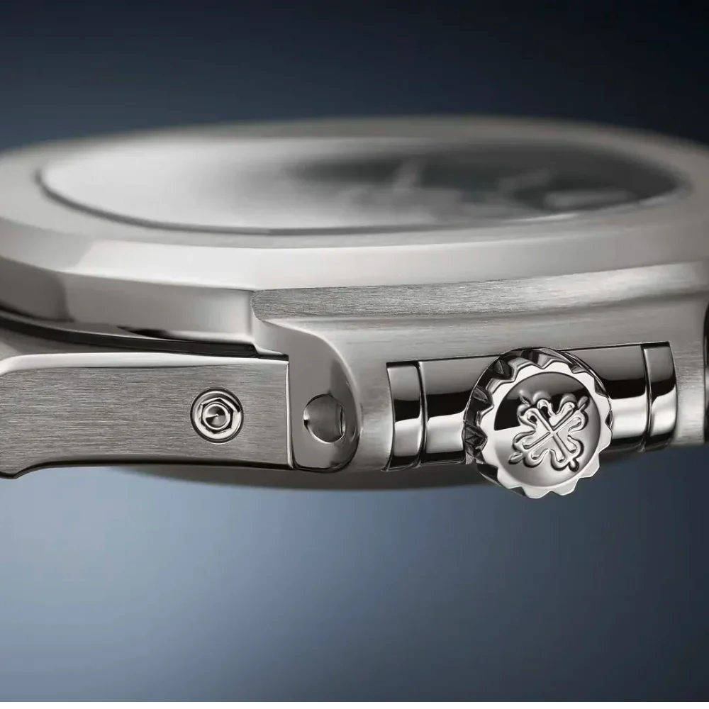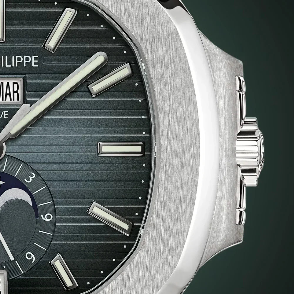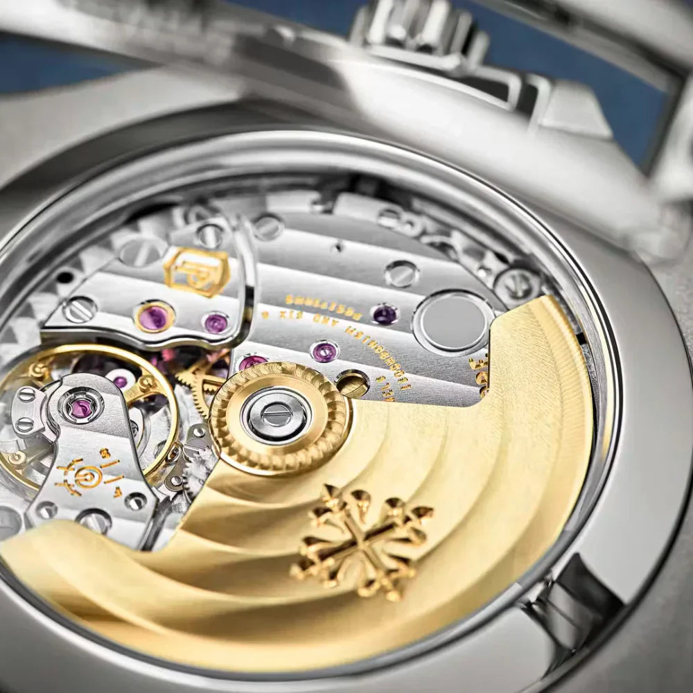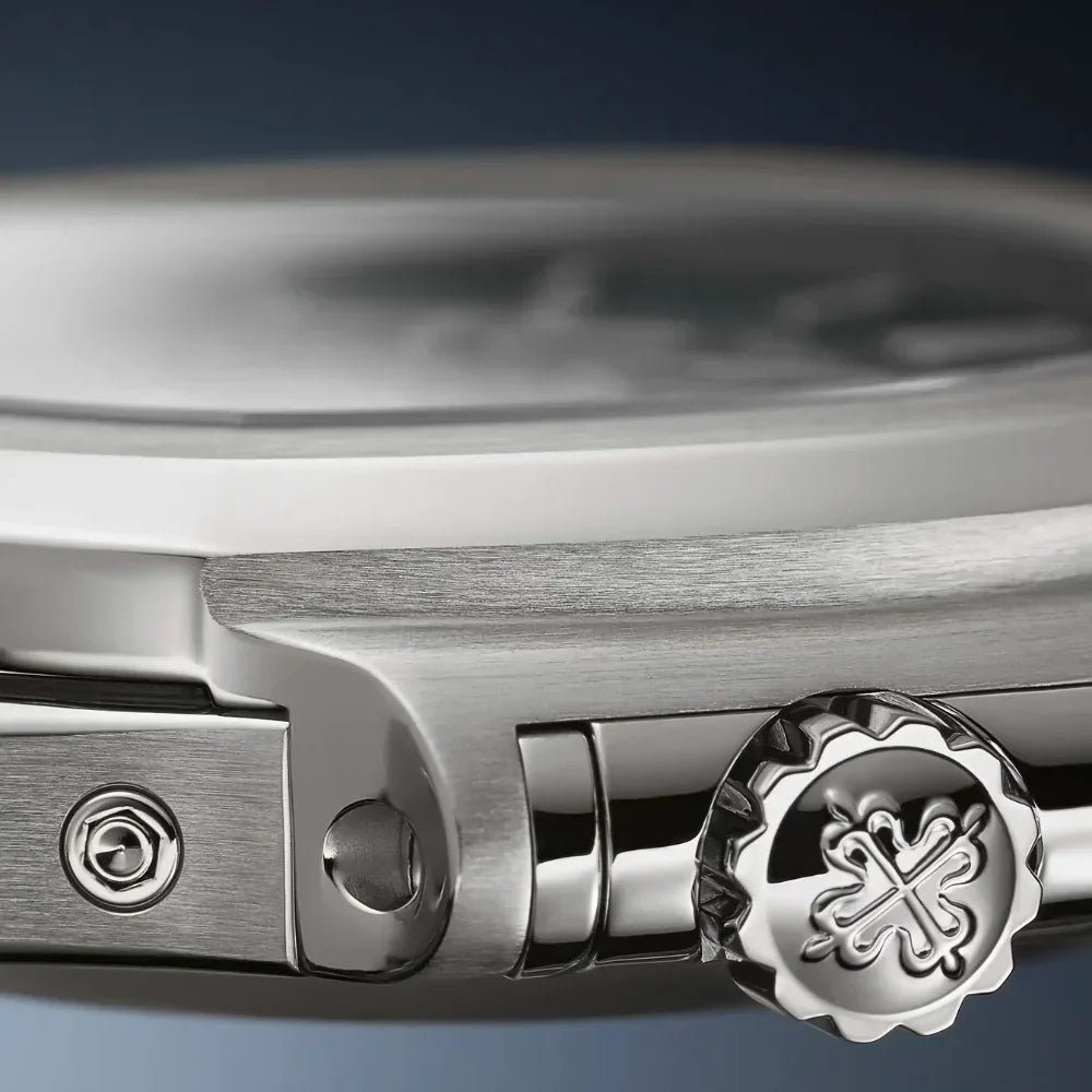 The PP Nautilus Annual Calendar Moonphase Ref. 5726/1A-014 unites the iconic Gerald Genta-designed Nautilus case with refined horological complications. Crafted in stainless steel with an integrated bracelet, this 40.5 mm timepiece features a captivating blue gradient dial, shifting from sunburst brilliance at the center to deep black shading at the edges. Its balance of sporty elegance and technical sophistication makes it one of the most sought-after Nautilus references.