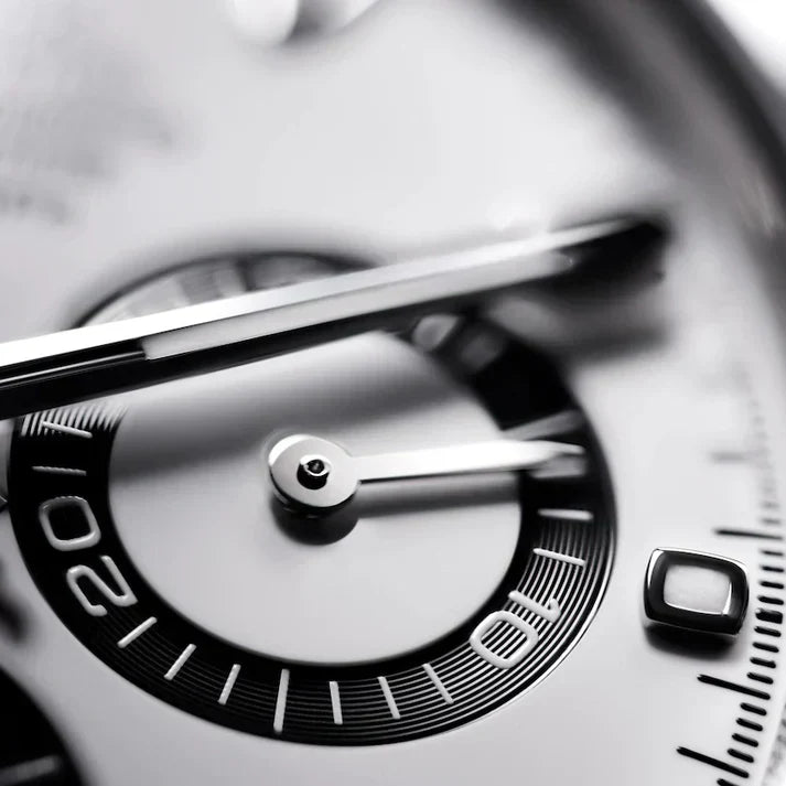 Dial: White lacquer with black snailed sub-dials (30-min at 3 o’clock, 12-hr at 9 o’clock, small sec at 6 o’clock)
